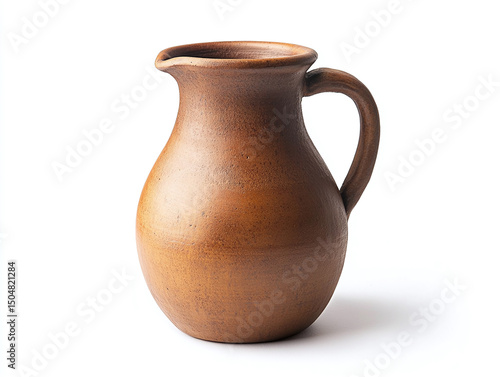 A hand-thrown pottery jug, isolated on a clean white background, with a rounded design and no shadow.