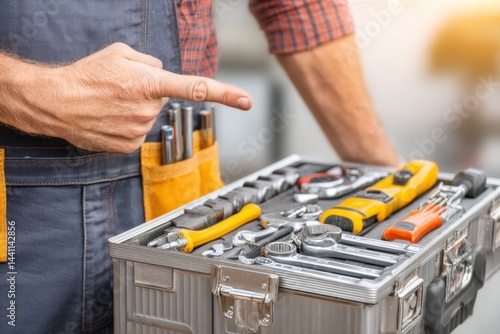 A handyman points towards a toolbox full of various tools, ready for home repairs and maintenance, work concept, worker with toolbox, workshop, instruments, occupation.
