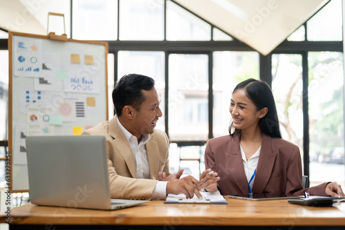 A happy Asian businessman is sharing ideas, brainstorming, and working with a female colleague