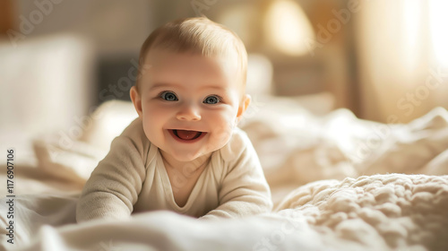 A happy baby newborn is smiling while on an bed