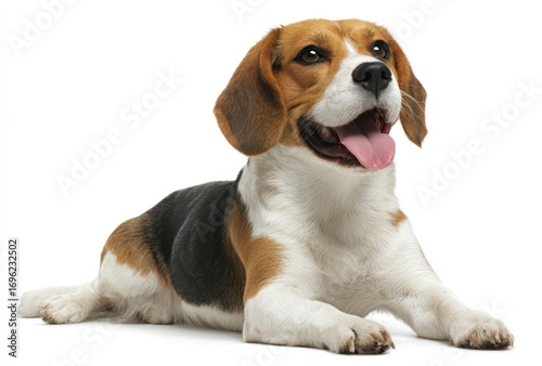 A happy beagle dog with brown, black and white fur is lying down, looking up with its tongue out, isolated