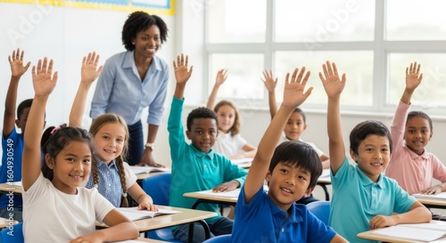 A happy diverse group of elementary school children enthusiastically raise their hands to answer questions in a bright classroom, with their teacher smiling in the background.