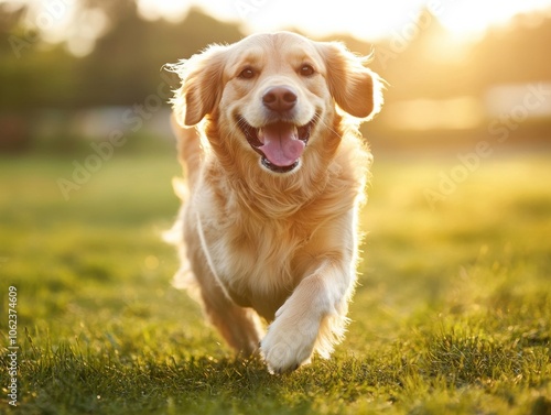 A happy dog joyfully runs on a sunlit green grass lawn, capturing the essence of playful freedom and cheerful energy.