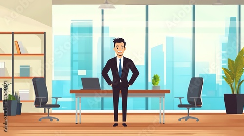 A happy executive man smiling confidently as he steps in front of a meeting room in a modern office interior. The man exudes professionalism and positivity, surrounded by sleek office furniture,