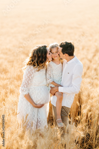 A happy family is waiting for a child, a pregnant woman, a man and their daughter in a wheat field