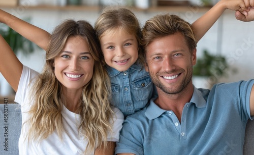 A happy family of three sitting on the sofa in their living room, smiling and posing for photos with arms outstretched to show off an empty space behind them