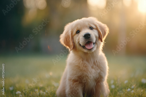 A happy golden retriever puppy sits on grass with a blurred natural background and warm sunlight, looking cheerful and playful.