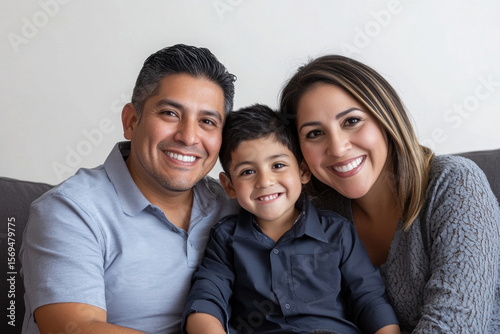 a happy Hispanic family with their son smiling at the camera while sitting on a sofa