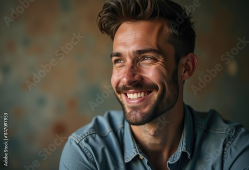 A happy man with a beard smiles, looking off to the side, wearing a denim shirt.