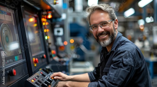 A happy middle-aged man in work stands at the control panel of an industrial CNC machine and smiles.