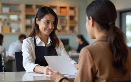 A happy receptionist is giving papers to a guest to sign up. High quality