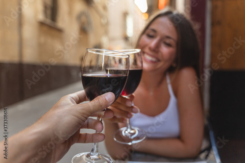 a happy woman drinks a glass of red wine with her boyfriend in the restaurant