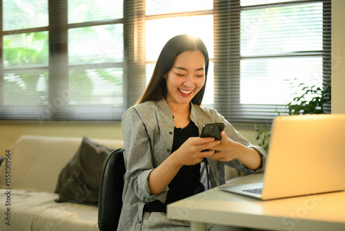 A Happy young woman engaging online from home, Digital Lifestyle and Remote Work