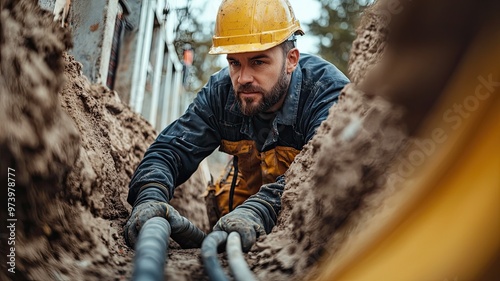 A hard-working construction worker installs cables in a trench, showcasing dedication and skilled labor in an outdoor environment.