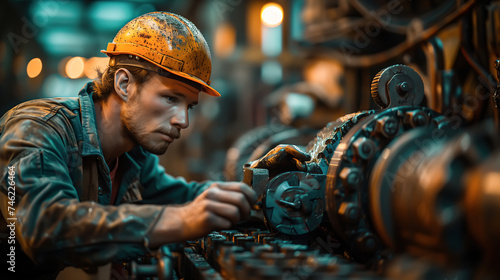 A hardworking male worker is busy at work inside a factory. A man worker focuses on tasks and contributing to the production process. Generative AI.