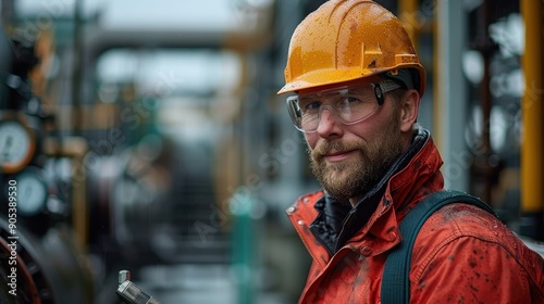 A hardworking man wearing an orange helmet and red rain jacket, drenched in rain, stands amidst an industrial setup focusing on his tasks with sheer determination.