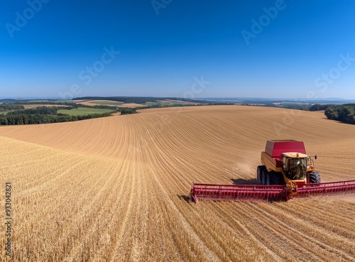 a harvest machine working on it and a blue sky background