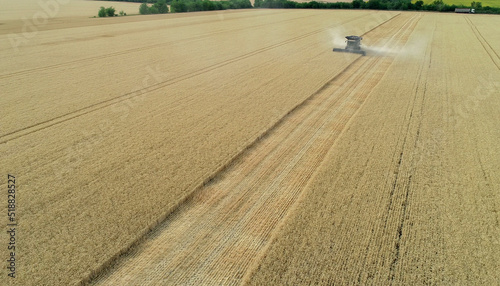 A harvester combine collects growing wheat in a grain carrier on a farm field