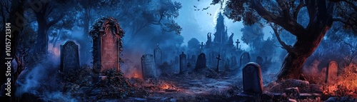 A haunting graveyard at night, illuminated by eerie blue light. Tombstones stand among twisted trees, creating a chilling atmosphere.