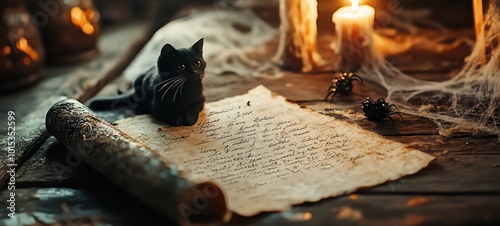A haunting Halloween party invitation written on a vintage scroll, lying on a dusty table. A black cat figurine, spider webs, and flickering candlelight complete the eerie atmosphere