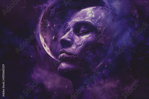 A haunting image of a man's face merging with the shadows of the night sky, illuminated only by the soft glow of a purple moon.