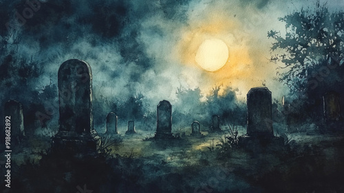 A haunting scene of a graveyard under the light of a full moon, with fog drifting among old tombstones, creating an eerie and mysterious atmosphere.