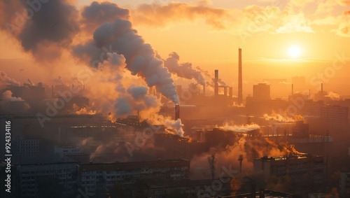 A hauntingly beautiful industrial skyline emerges at dawn, as billowing smoke intertwines with golden light, revealing a complex narrative of progress and pollution.
