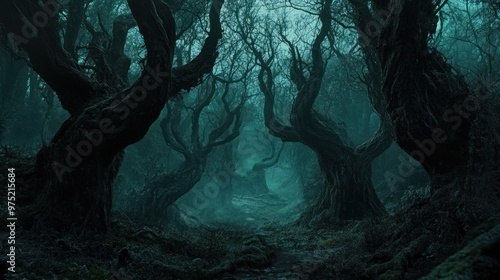 A hauntingly beautiful scene of a dark, overgrown forest with twisted trees, deep shadows, and a sense of eerie stillness