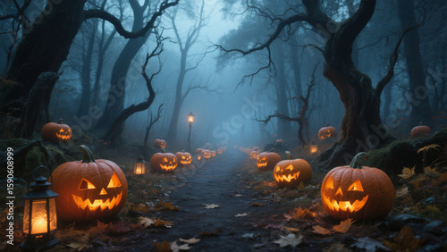 A hauntingly serene Halloween scene featuring a forest path lined with carved jack-o'-lanterns, their glowing faces casting an eerie light through the misty woods. Halloween, Halloween Costumes