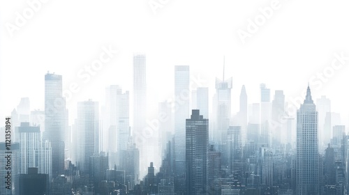 A hazy cityscape, showcasing a dense collection of skyscrapers reaching towards a bright, white sky. The muted blues and grays create a serene yet powerful mood.