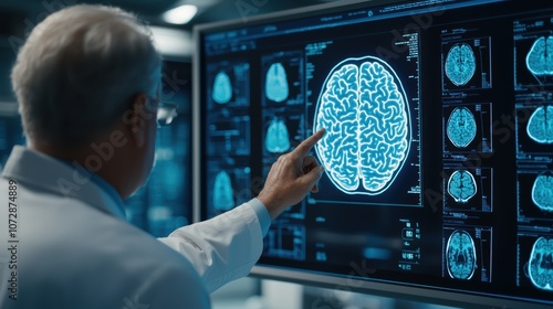 A healthcare professional examines brain scans on a digital display, focusing on intricate neural patterns for analysis and diagnosis.