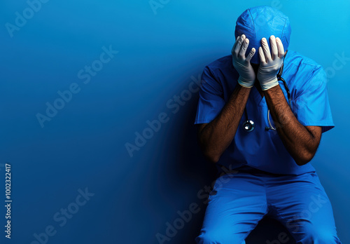A healthcare professional in scrubs shows visible signs of emotional distress, hands covering their face.
