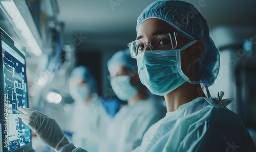 A healthcare professional monitors medical data on a screen while wearing protective gear in a clinical setting.