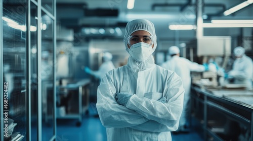 A healthcare worker in protective gear stands confidently in a sterile environment, surrounded by colleagues, emphasizing safety and professionalism.