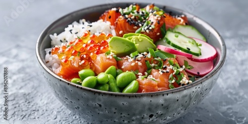 A healthy and colorful bowl of sushi with rice, salmon, seaweed, pickles and avocado.