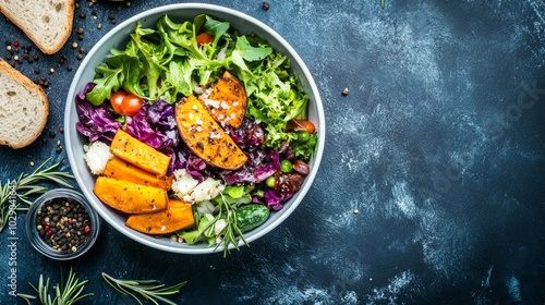 A healthy and colorful salad with roasted sweet potato, fresh greens, and feta cheese, served in a bowl on a dark background.
