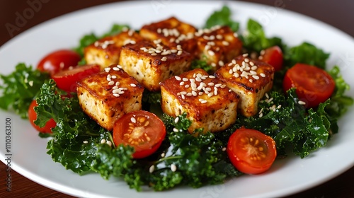 A healthy vegan salad with roasted tofu, kale, cherry tomatoes, and a sprinkle of sesame seeds, served on a white plate
