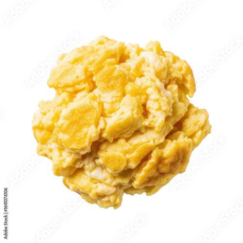 A heap of golden and fluffy scrambled eggs, a comforting breakfast food, neatly isolated on a pristine white background