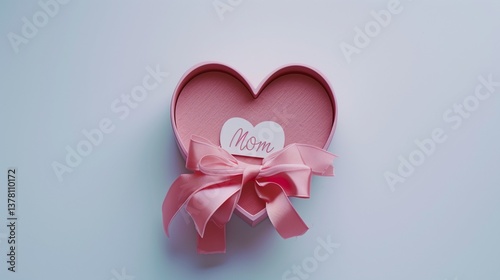 A heart-shaped gift box with a delicate ribbon and a "Mom" tag, floating on a white background.