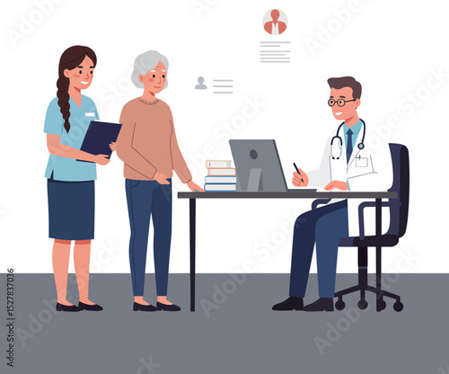 A heartwarming illustration of a doctor, nurse, and elderly patient in a medical setting.