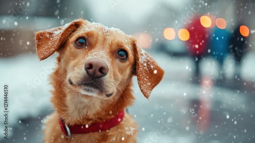 A heartwarming image of a golden dog adorned with snowflakes, joyful and alert, set against a backdrop of glowing city lights in the winter season.