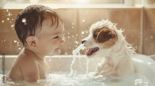 A heartwarming photo of a newborn baby and a puppy sharing a bath, splashing water at each other with big smiles on their faces