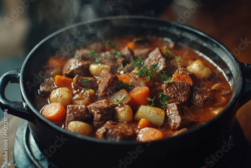 A hearty beef stew filled with tender meat and vibrant vegetables, steaming in a cast iron pot.