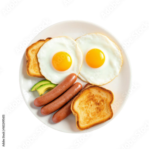 A hearty breakfast plate featuring two fried eggs, three sausages, avocado slices, and toasted bread, all isolated on a transparent background, offering a complete and satisfying morning meal