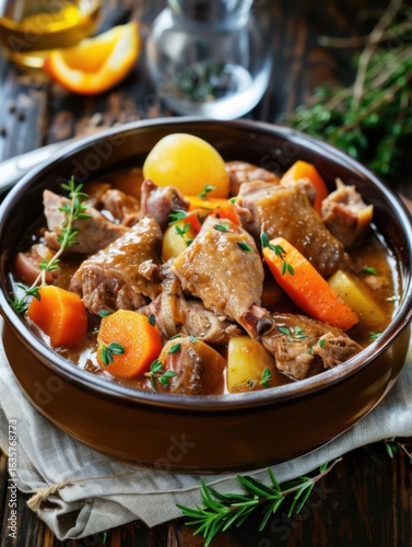 A hearty duck stew is presented in a bowl, featuring tender meat, bright carrots, and golden potatoes, all coated in a savory orange sauce. It rests on dark wood next to a linen napkin