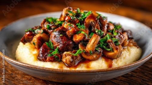 A hearty serving of sautéed mushrooms on a bed of creamy garlic polenta creates a comforting and flavorful dish that is both satisfying and visually appealing for any food lover.