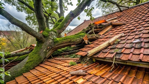 A heavy tree branch lies across a torn and buckled roof, its leaves scattered, with gaping holes and