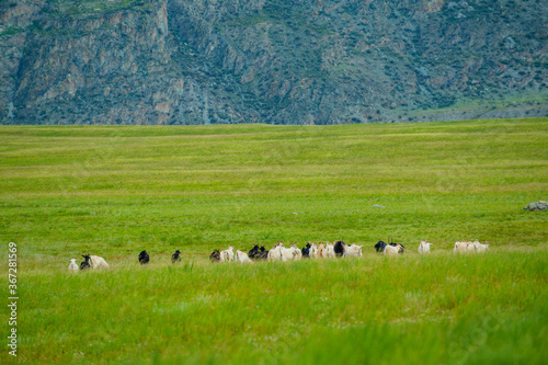 A herd of goats runs towards the mountains along the green grass. Altai animals