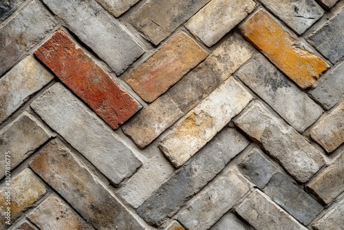 A herringbone pattern brick wall with multicolored bricks of varying shades of grey, brown, orange, and yellow.
