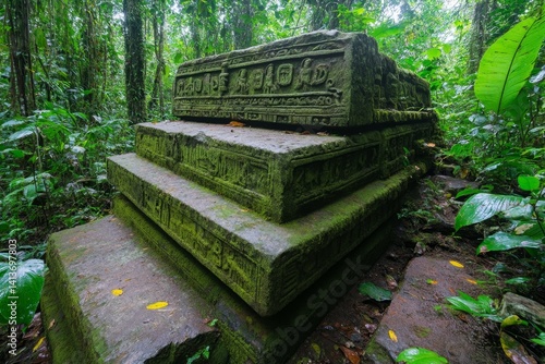 A hidden ancient pyramid in the dense Amazon rainforest, covered in lush vegetation